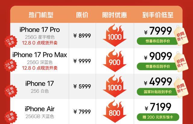 临近年底,很多人都计划用一部新手机或者一台新电脑来为过去一年的努力画上句号。对于打算升级苹果系列新品的用户来说,京东的12.12绝对是一个不容错过的绝佳机会。本次活动优惠力度堪比11.11,涵盖iPhone、iPad、MacBook、Apple Watch、AirPods等,充分满足大家的换机年需求。其中,购买指定iPhone 17 Pro系列,即可获赠300元惊喜优惠券、700元起贸易补贴,并享受12免息;指定iPhone 17系列将获得1000元国家补贴折扣加以旧换新补贴。值得注意的是,惊喜券将于12月8日0点生效,想要换新果粉的可以提早领取。此次京东12.12,实打实的折扣,为计划升级苹果系列新品的用户提供了颇具吸引力的选择。具体来说,t256G版iPhone 17 Pro将获赠300元惊喜优惠券,以旧换新补贴700元起,获得价格低于7999元; 256G版iPhone 17 Pro Max获300元惊喜优惠券,以旧换新补贴600元起,获得售价不到9099元; 256G版iPhone 17部分地区可获国家补贴500元,以旧换新补贴500元起,零售价4999元起; iPhone Air 256G版下单送200元京东餐卡一张,以旧换新补贴800元起,零售价7199元起。值得一提的是,上述手机最多支持24部免息手机,可以让大家轻松更换新手机。针对预算相对有限的用户,京东还在12.12准备了多款热门机型的折扣。例如256G版本的e iPhone 16在指定地区可领取500元国家补贴,且价格低于5449元,并享受12年免息; 128G版iPhone 16 Pro可获500元消费券,售价5649元; 128G版iPhone 15可获得500元国家补贴,以旧换新补贴400元,价格更是低至2899元。 iPad系列方面,京东于12.12推出iPad Air 11英寸限时优惠1200元,指定区域还可再享400元消费券。购买指定iPad Pro还可获赠500元优惠券等福利。以热销的2025 iPad Air 11英寸256G WLAN版为例。限时优惠1200元。指定区域即可领取400元消费券,低至3689元即可获得;对于年底想要升级设备的消费者来说,京东12.12 w带来限时直降、10%政府补贴、以旧换新、MacBook 300元起支付等诸多福利。其中,13英13.6英寸MacBook Air M4(10+8核)16+256G版限时优惠1800元,国家补贴10%,以旧换新补贴300元起,售价不到5579元; 13.6英寸MacBook Air M2(8+10核)24+512G版限时优惠3250元,售价6449元; 2025款MacBook Pro 14英寸M5(10+10核)16+512G版政府补贴1000元,最终售价11999元。购买Apple Watch新品,可享受12期免息、最高600元的贸易补贴、以及15%的国家补贴。 Apple Watch S11 GPS 42mm版贸易补贴高达600元,加上补贴后价格不到2700元; Apple Watch S10 GPS 42mm版直接优惠700元,交易价高达600元,最低价为2299元。 AirPods系列也有100元起的优惠,指定型号还可享受额外的贸易补贴。 AirPods Pro(第三代)搭配Magsafe充电盒,获得国家补贴和以旧换新补贴后不到1804元; AirPods Pro(二代)搭配Magsafe充电盒,拿到国家补贴后不到1399元。与此同时,京东还针对苹果生态服务推出了诸多福利。其中,iCloud+ 200GB 12个月福利套餐首次激活专享15%折扣,不到214.2元; AppleCare碎屏保险可享受限时10%折扣。如果你也想换苹果新品,何不现在就去京东领取300元惊喜优惠券呢? 12月8日发售,千万不要错过!